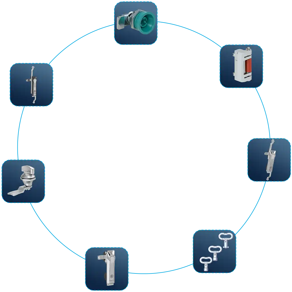 محصولات ما از جمله قفلها، لولاها، دستگیرهها و یراقآلات جانبی، برای طیف گستردهای از تابلوهای صنعتی از جمله تابلوهای ایستاده (قفسههای برق)، تابلوهای دیواری، تابلوهای رک، تابلوهای فشار قوی (MV) و (LV) و محفظههای کنترل طراحی و تولید شدهاند. برای اطمینان از سازگاری، مدل محصول مورد نظر خود را با مشخصات فنی